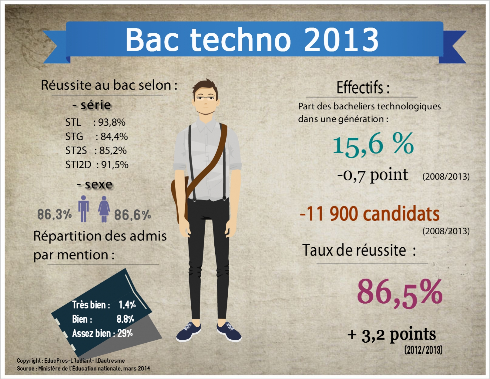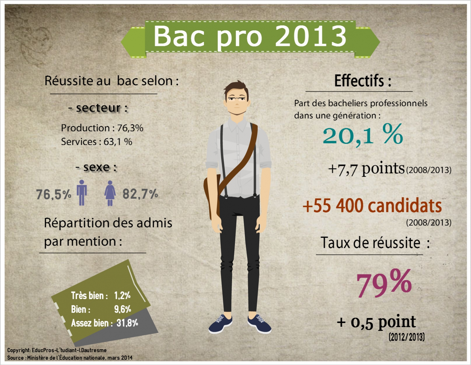 Deux fois plus nombreux qu’en 2009, les candidats au bac pro, cuvée 2013, ont vu leur taux de réussite à l’examen se stabiliser pour la première fois depuis trois ans. Voilà ce qui ressort d'une note d'information de la DEPP (Direction de l'évaluation, de la prospective et de la performance) publiée en mars 2014. La série technologique, quant à elle, continue de perdre des candidats