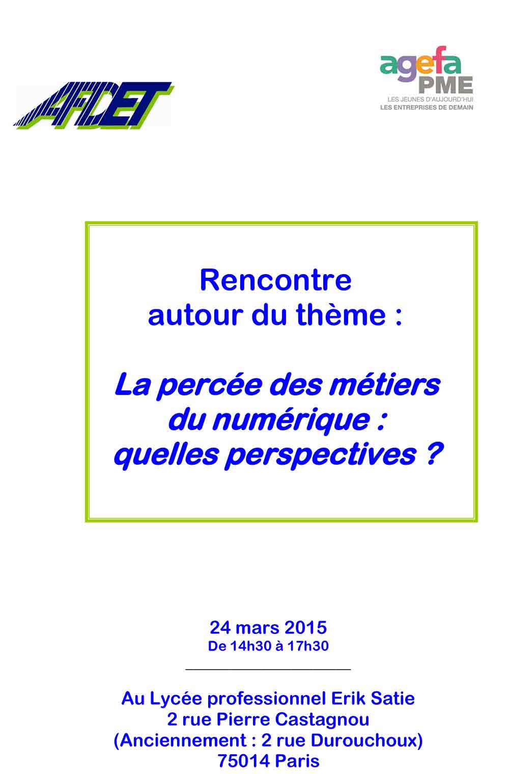 L’AFDET et l'AGEFA PME organisent au Lycée Erik Satie à Paris, le mardi 24 mars 2015 à 14h30 une rencontre sur le thème "La percée des métiers du numérique : quelles perspectives?" et seraient heureux d'accueillir les Chefs de Travaux.